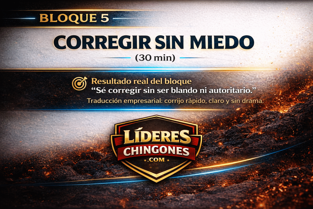 BLOQUE 5 CORREGIR SIN MIEDO LÍDERES CHINGONES · BLOQUE 5 EJERCICIO: Corrección con Fuego 20–25 min · Acción real Aquí se entrena liderazgo, no teoría. Regla: escribe conductas (no personas), sin justificar, y con fecha de acción. PARTE 1 — Radiografía del problema Detecta lo que hoy estás permitiendo. 5 min 1) Conducta tolerada (una sola) Ej: llegadas tarde · excusas · falta de seguimiento · pasivo-agresivo. 2) ¿Desde cuándo ocurre? 3) ¿Cada cuánto se repite? 4) Costo real (sin drama, con negocio) ¿A quién afecta? ¿Qué mensaje manda? ¿Qué costo estás pagando por no corregir? PARTE 2 — Responsabilidad del líder Aquí se rompe el autoengaño. 6 min 5) ¿Qué hiciste (o no hiciste) para que esto se volviera normal? No corregí a tiempo Corregí una vez y solté Evité el conflicto Fui ambiguo Premié resultados aunque la conducta era incorrecta Me dio miedo perder a la persona 6) ¿Qué te dio más miedo? Sin justificar. Una frase. 7) Completa esta frase Responsabilidad, no culpa. PARTE 3 — Fórmula de Corrección Clara (FCC) Corrección profesional: clara, firme, sin humillar. 8 min 1) Hecho observable (sin juicio) 2) Impacto real (negocio / equipo) 3) Expectativa concreta (desde hoy) 4) Consecuencia clara (sin amenaza) 8) Depuración (tacha tu basura emocional) Escribe aquí frases que suenen a regaño/disculpa/ataque… para NO decirlas. PARTE 4 — Decisión incómoda Si no hay fecha, no hay liderazgo. 6 min 9) ¿Cuándo la vas a decir? Hoy Mañana Esta semana 10) ¿Dónde la dirás? En privado En junta Uno a uno formal 11) Fecha límite (si aplica) Opcional, pero recomendado. 12) Compromiso escrito Completa: “Si no hago esta corrección antes del ____, acepto que estoy eligiendo seguir tolerando el problema.” Generar mi plan de corrección Enviar a WhatsApp (4422845781) Reiniciar Nota: WhatsApp se abre en una pestaña nueva. Si tu navegador bloquea popups, habilítalos para este sitio. Plan de Corrección (listo para ejecutar)